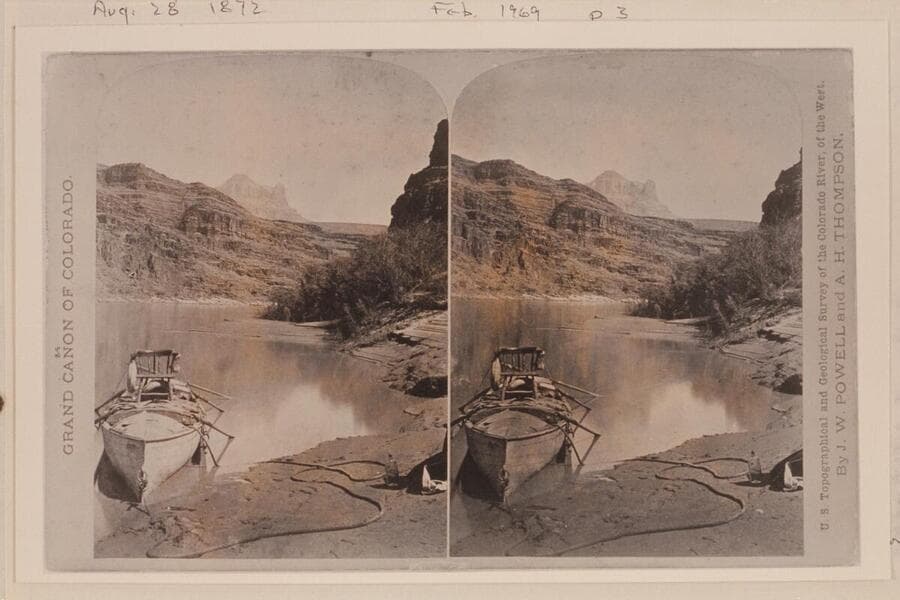 [print from a stereo] The "Emma Dean" with the Powell throne amidships. Up to 1954, this arrangement of the chair appears to hold the crown for the most stupid seamanship on Colorado River history