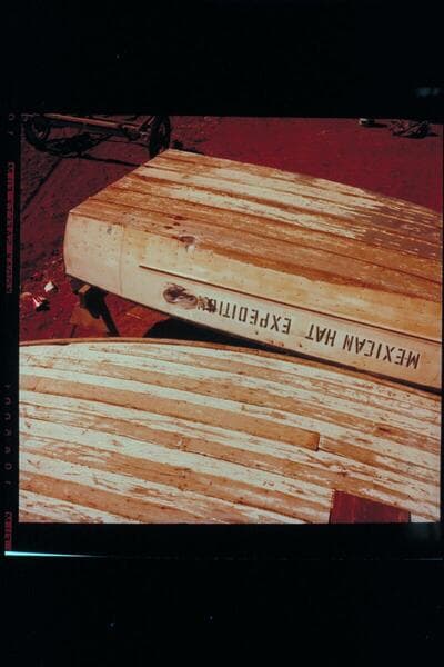 Mexican Hat Expedition motor boat showing battering; Wright's yard at Blanding
