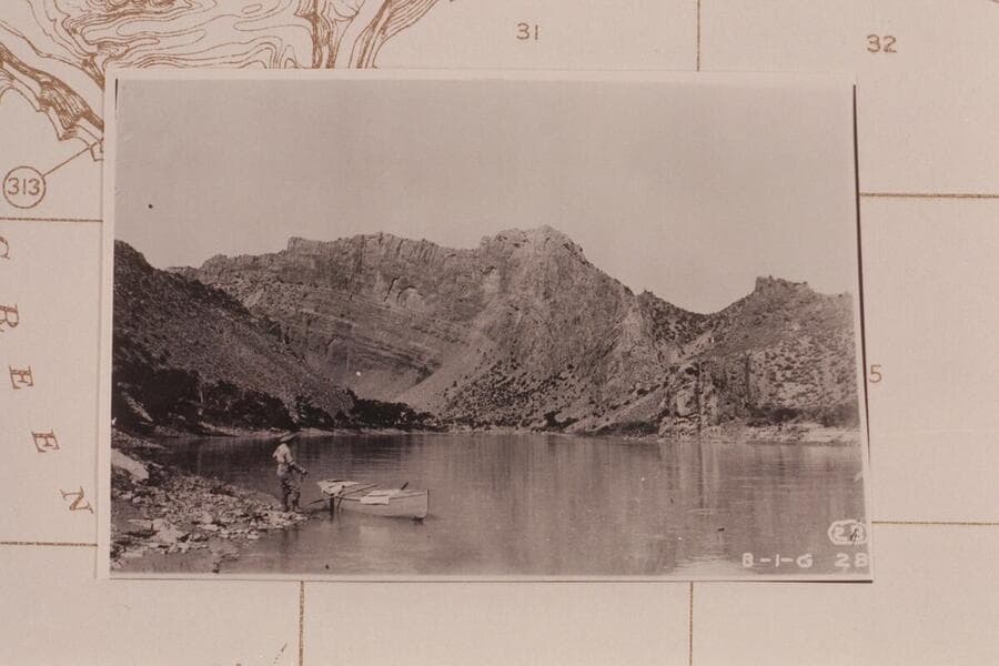 Dubendorff holds his boat at the mouth of Flaming Gorge as Cogswell takes his photo