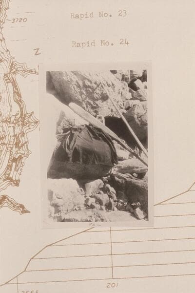 Boat, pole and oar at wreck at Rapid #24. Coat and oars pole [sic] 1/25 at 16. Coat was made by Kellop and Wardner, Idaho. Belonged to D. W. Hadley