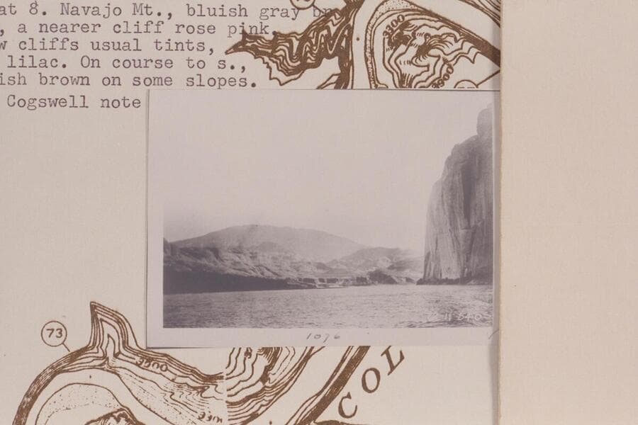 Down Glen Canyon from Mile 71.9. Whisky Flat is center left. Navajo Mountains in the distance