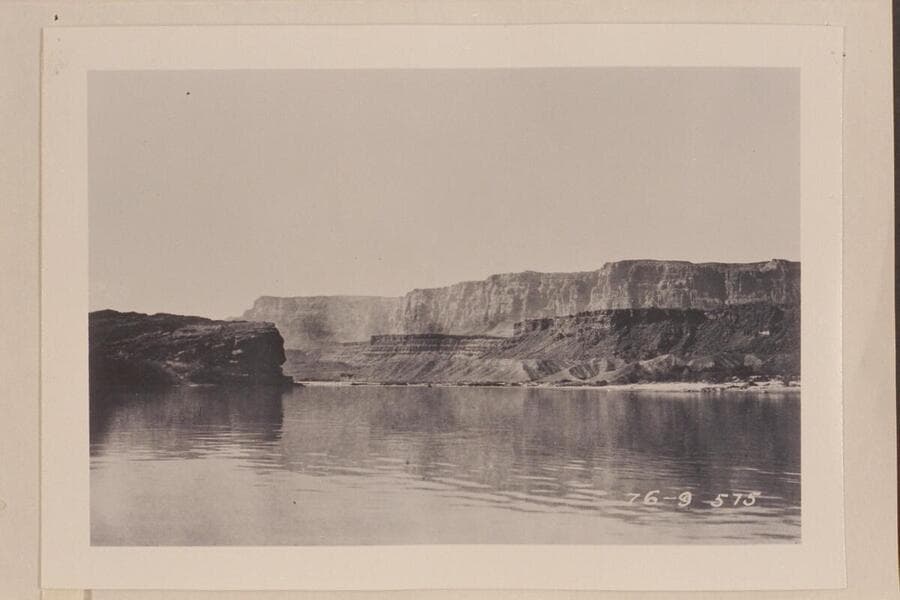 Lower end of Glen Canyon showing Vermillion Cliffs in background. At Lees Ferry. The cliffs in the background are the Vermillion Cliffs of the Paria Plateau