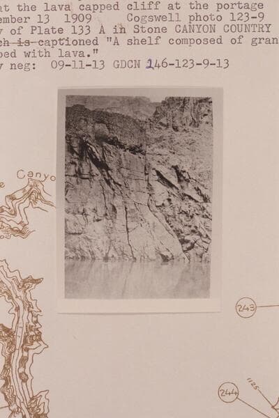 A view of the Grand Canyon with the Bass Camp along the rim on the left. There is a man sitting on a chair mounted on a box in the shade of a tree, and he seems to be reading something. "3081" written in white in the lower left corner.