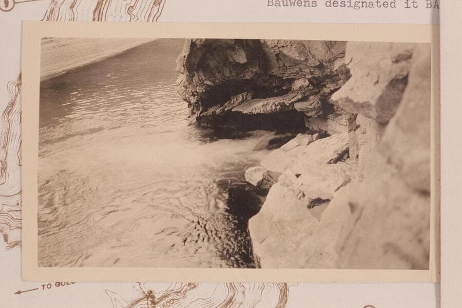 The Blue Spring of the Little Colorado River. Exploration trip. Stalactites above water. Bauwens used the name "Baum Spring."