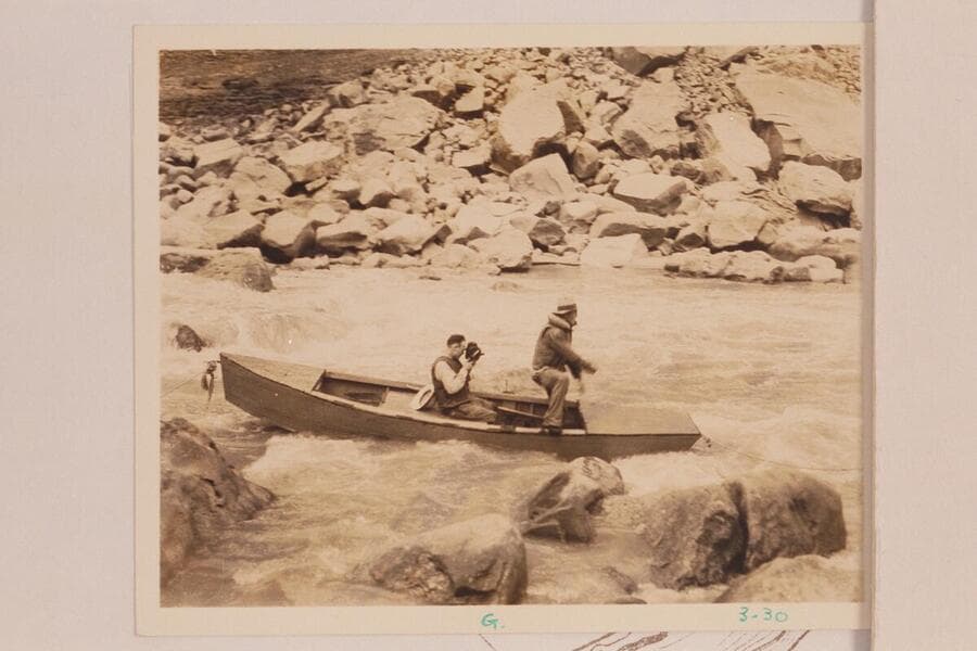 Fred C. Jayne making motion pictures from a skiff being lined in Soap Creek Rapid on a flow registered at lees Ferry of 1,530 cfs