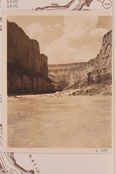 Up Marble Canyon from about Mile 43, above Harding Rapid. Captioned "Above President Harding Rapids"