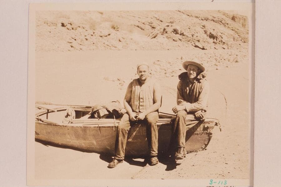 Seven of the Dusty Eight: Bus Hatch, Fred C. Jayne, Russell G. Frazier, Royce Mowrey, Frank Swain, W. J. Fahrni and Alton Hatch. Mouth of Chuar Creek