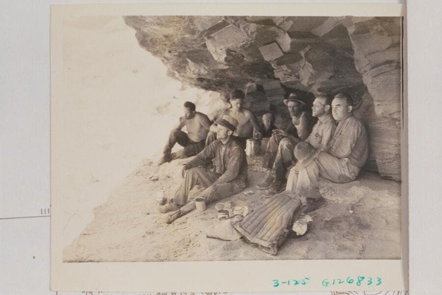 1934 crew in shade for lunch between 2-3 P.M. near Mile 75