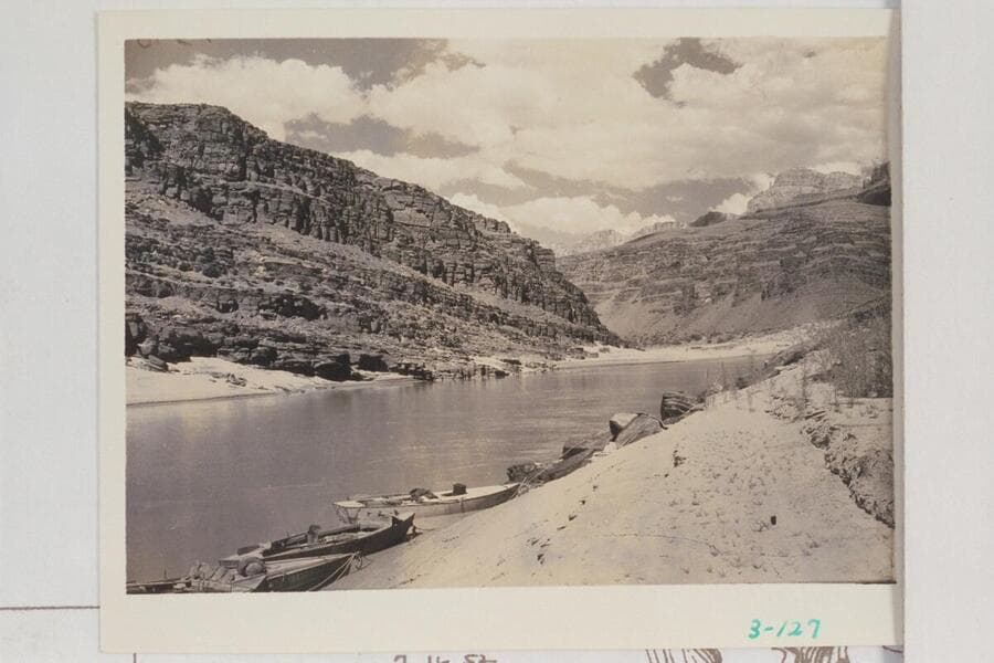 Skiffs of the 1934 crew moored near Mile 75 for lunch stop, 2-3 P.M