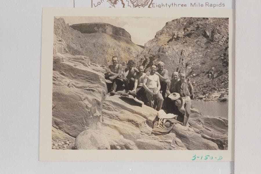 Seven of the Dusty Eight: Bus Hatch, Fred C. Jayne, Russell G. Frazier, Royce Mowrey, Frank Swain, W. J. Fahrni and Alton Hatch. Mouth of Chuar Creek