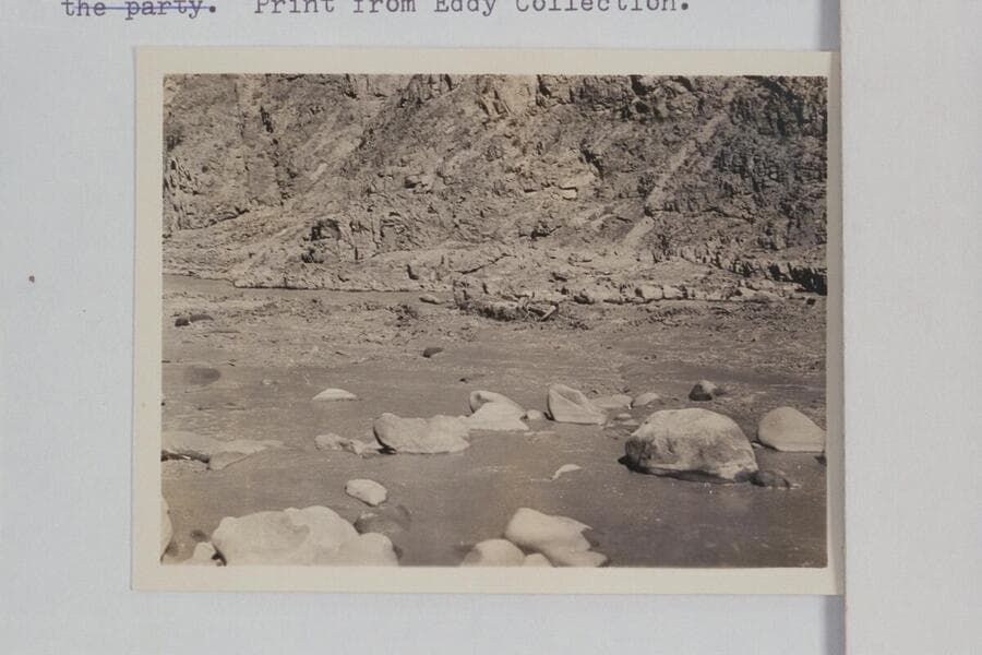 Skiff of the Dusty Dozen takes a wave shown at center of print in Pipe Creek Rapid
