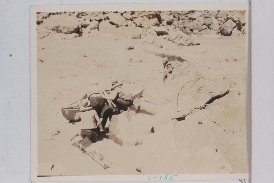 Bus Hatch and one of the skiffs below Monument Creek Rapid during noon stop of 1934, July 27. Bright Angel gauge: 2,070 cfs