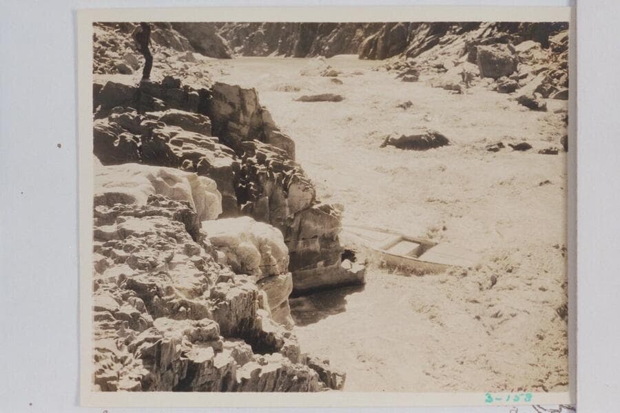 Monument Creek Rapid, where the Dusty Dozen arrived 1934, July 27, 12:40 PM. Bright Angel gauge: 2,070 cfs