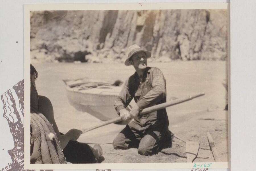 Bus Hatch and one of the skiffs below Monument Creek Rapid during noon stop of 1934, July 27. Bright Angel gauge: 2,070 cfs