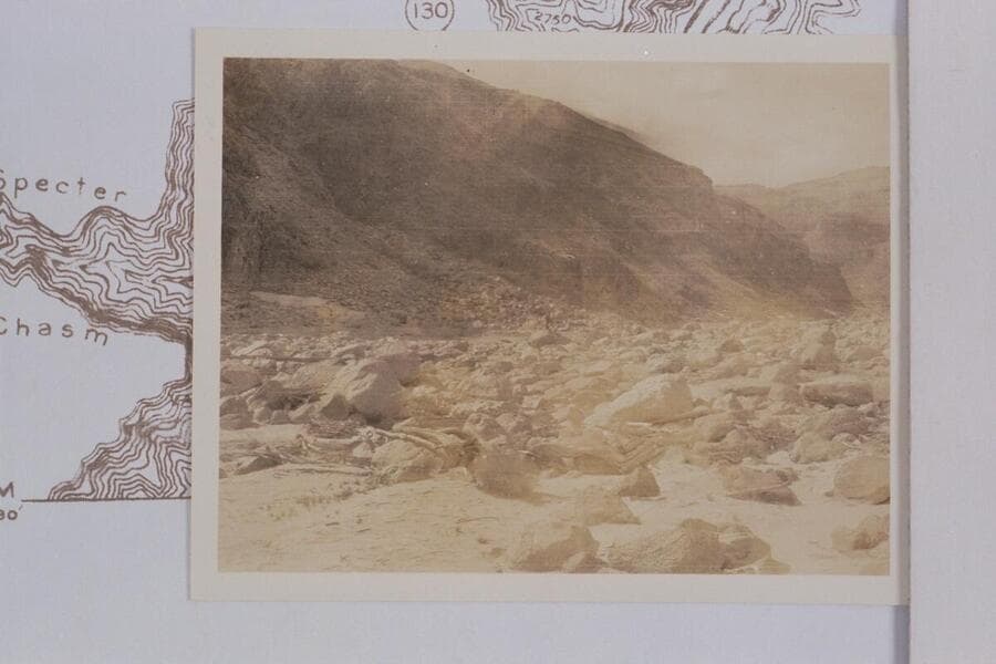 Downriver at Dubendorff Rapid. The rocks in foreground trapped the Eddy boat "Powell" 1927, July 27, when the river state was about 20,000 cfs