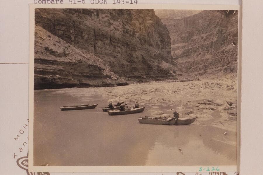 Crew and boats of the 1934 party at the mouth of Kanab Creek with Kanab Creek Rapid in background