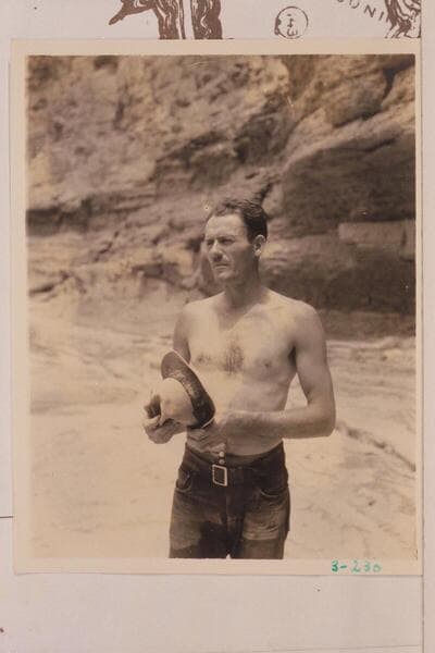 Crew and boats of the 1934 party at the mouth of Kanab Creek with Kanab Creek Rapid in background
