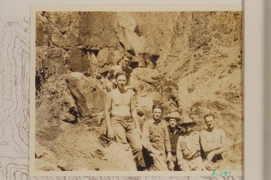Members of the 1934 crew under the dripping spring at Mile 155 1/2