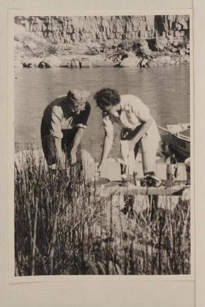 Millie Baker and Doris Nevills washing dishes on the 1940 river trip