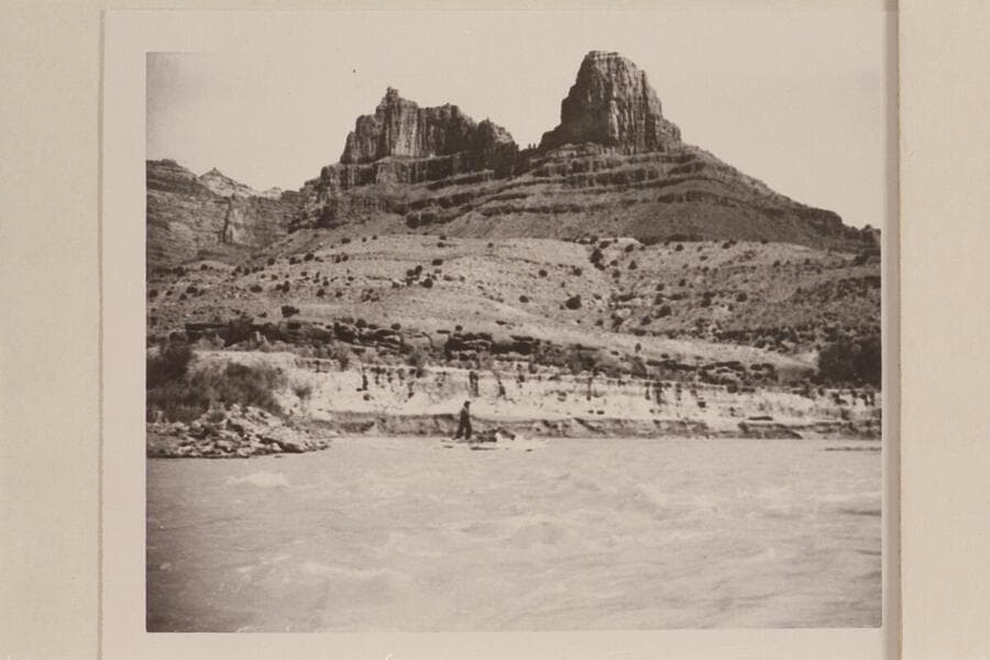 Lunch siesta for Millie Baker. Between Sharp Rock Falls and mouth of Price River. Green River. Price River enters river at Mile 18.15