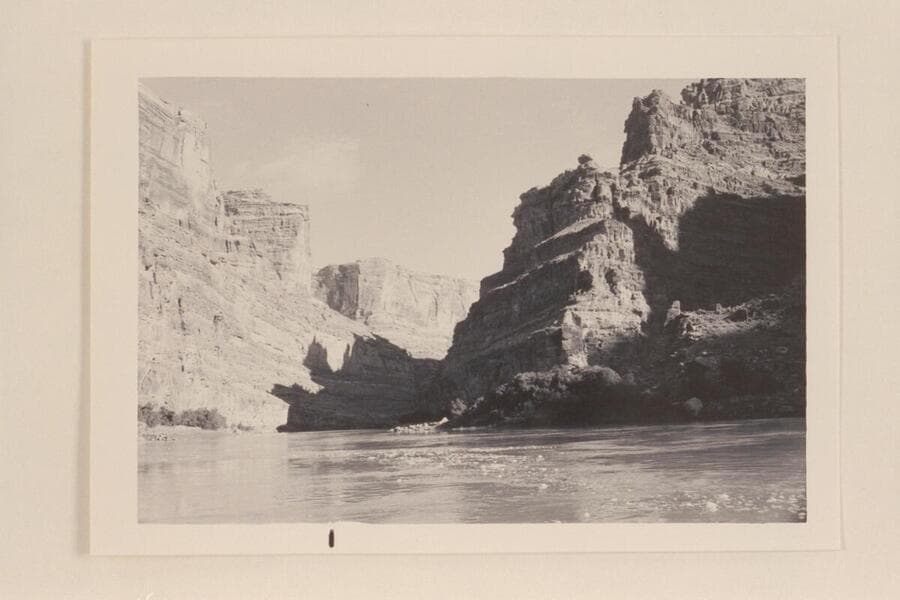 In Cataract Canyon Mile 184. Her caption on the back of the print reads, "Rock Slide Mile 184."