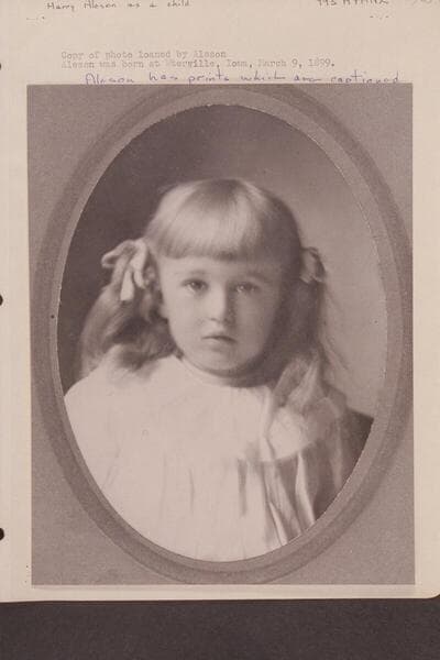 Harry Aleson as a child. Aleson was born at Waterville, Iowa, 1899, Mar. 09. Aleson has prints which are captioned "at 3 1/2--1902?"