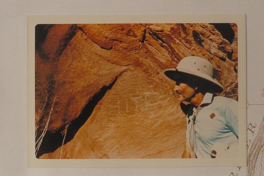 Harry Aleson looking at the Hite inscription at a small indent at Mile 143.9 RB in Glen Canyon