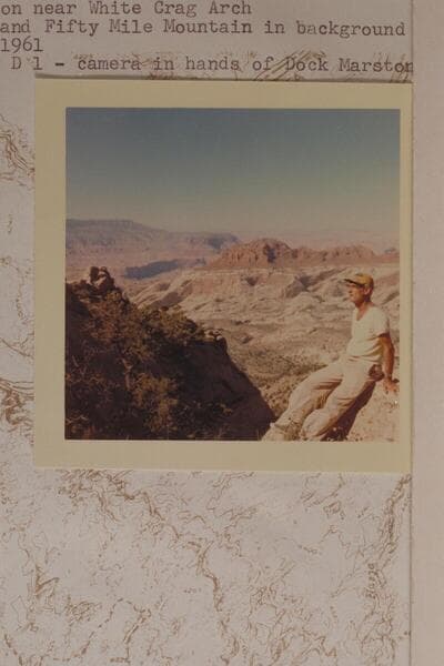 Ballard Atherton near White Crag Arch. Rainbow Butte and Fifty Mile Mountain in background