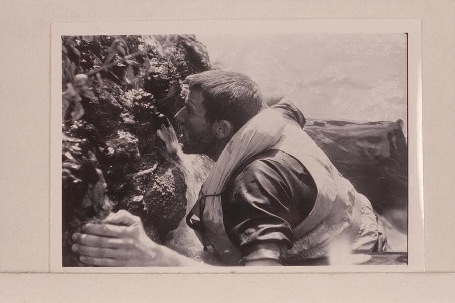 Bill Beer preparing for "swim" through Hance Rapid. Hance was the only rapid which Beer and Daggett did not swim in 1955