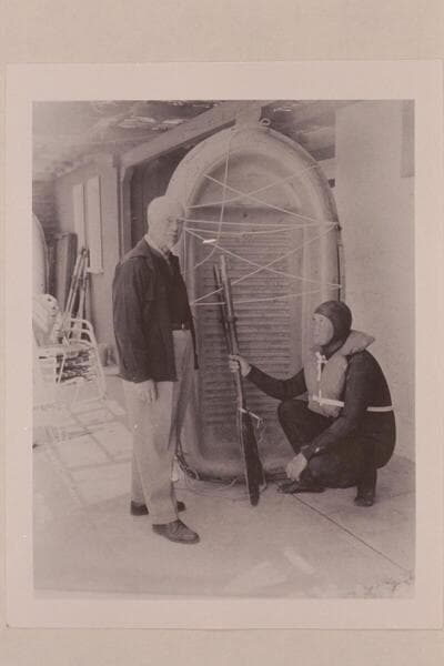 Dock Marston and Bill Belknap with Sportyak used in 1964 transit of Cataract Canyon. News photo with Polaroid camera