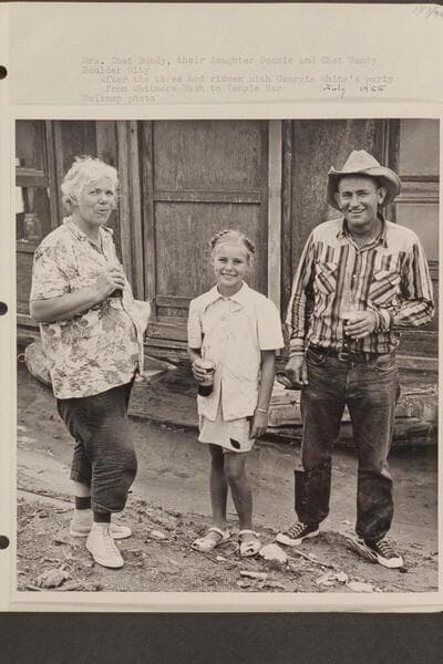 Mrs. Chet Bundy, their daughter Bonnie and Chet Bundy; Boulder City- After the three had ridden with Georgie White's party from Whitmore Wash to Temple Bar
