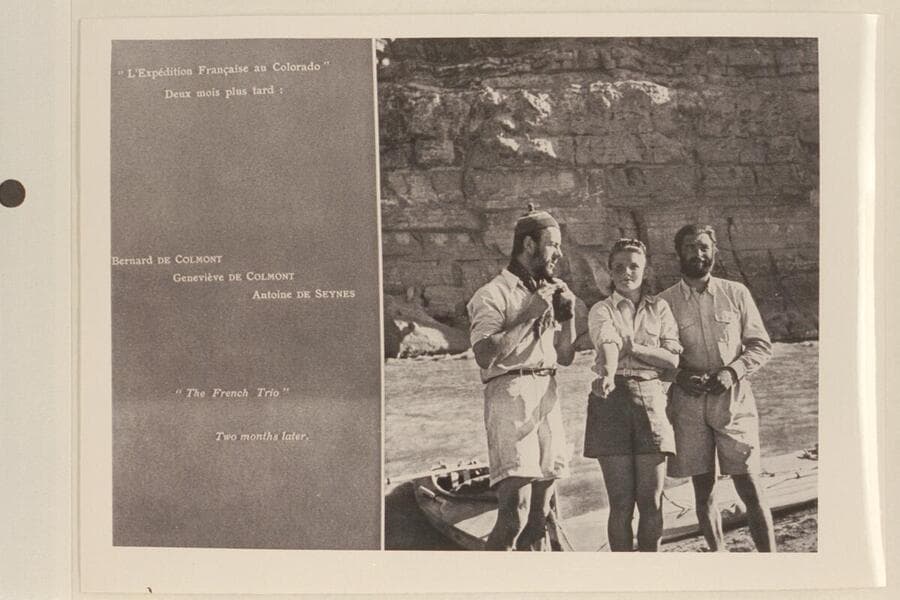 French trio near end of trip. The trio traveled in kayaks from Green River to Lees Ferry. Copied from album sent to friends in the United States