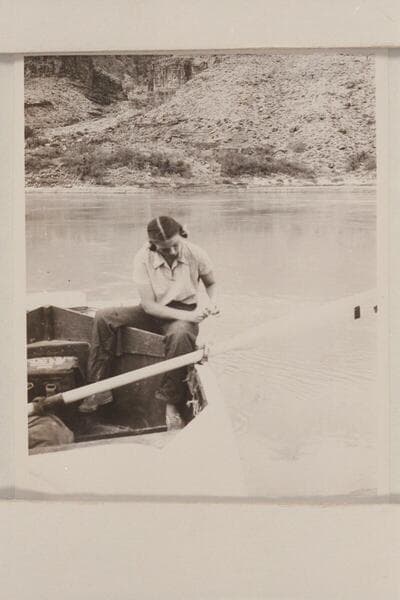 Anne Desloge cleaning fish. The boat is moored at the beach below Tapeats Creek