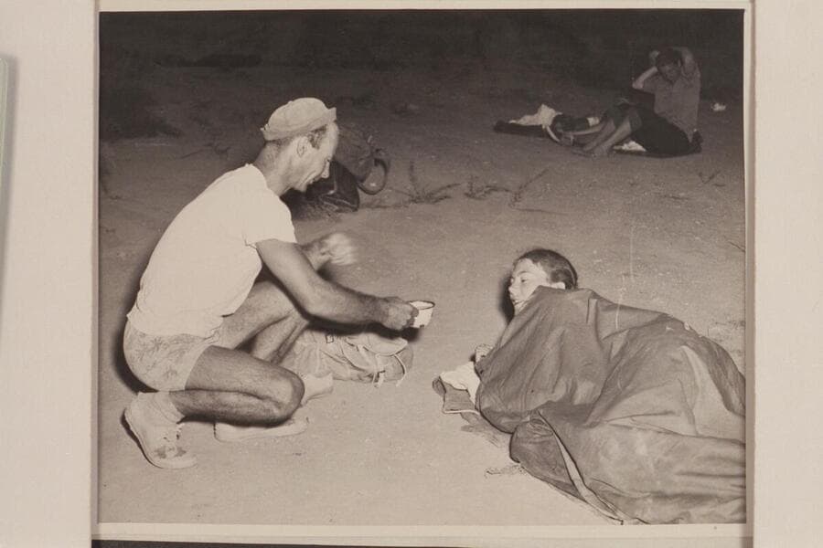 Zoe Desloge at end of 1947 traverse, while Marie Saalfrank sits in background; Pierces Ferry