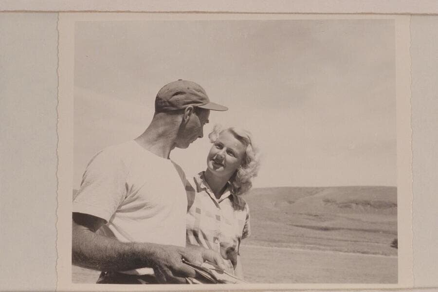 Norm Nevills marks hat for Margaret Marston near end of 1947 run. Probably at Diamond Creek