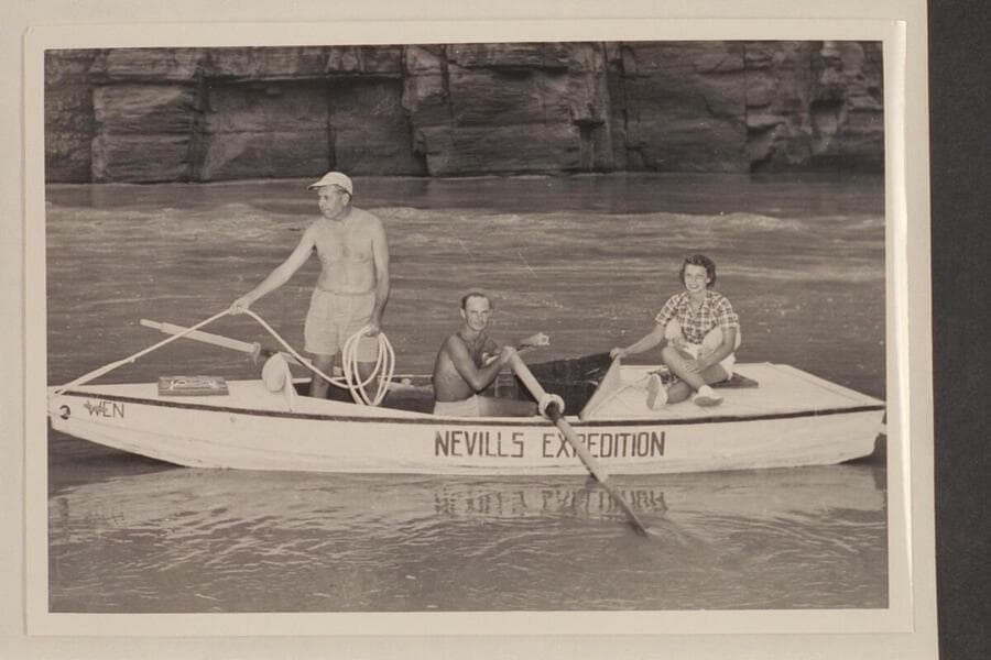 John Doerr, Norm Nevills and Nancy Streator in the "WEN" at the mouth of Supai Creek, Grand Canyon