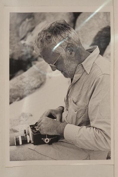 Joe Eisaman with his Bolex; Grand Canyon traverse of 1954, June