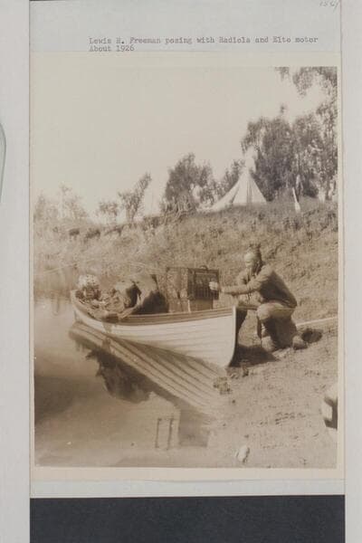 Lewis R. Freeman posing with Radiola and Elto motor
