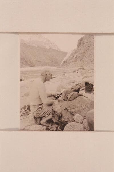 Randall Henderson typing up his notes during his traverse of the Grand Canyon in 1947, July