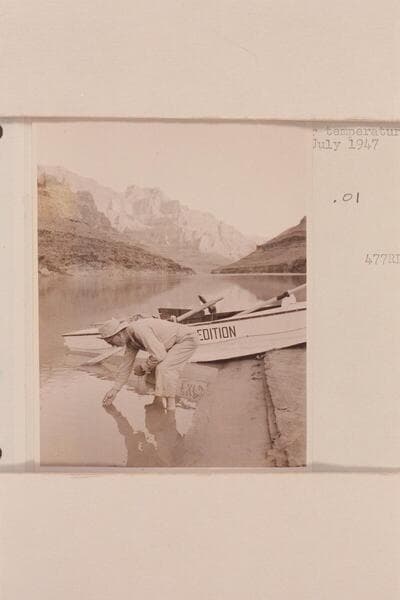 Randall Henderson measuring river temperature; Nevills Grand Canyon party of 1947, July