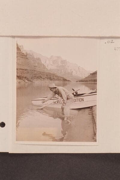 Randall Henderson measuring river temperature; Nevills Grand Canyon party of 1947, July
