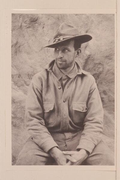 Glenn Kershner, head cameraman, taken at Dark Canyon camp in Cataract Canyon. Pathe-Bray party