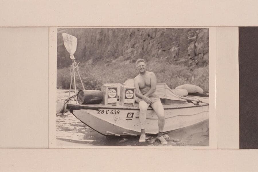 "Ed" Hudson posed on his motorboat "Esmeralda"; Bright Angel Creek