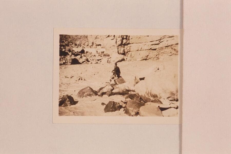 Bessie Hyde posed on the rock fan at the left bank of 27 Mile Rapid, Marble Canyon