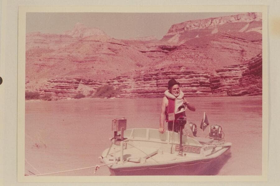 Ed l'Anson in the "Bootoo." Camp at Mile 70. Ed was the FIRST man to go through the Grand Canyon wearing a plug hat