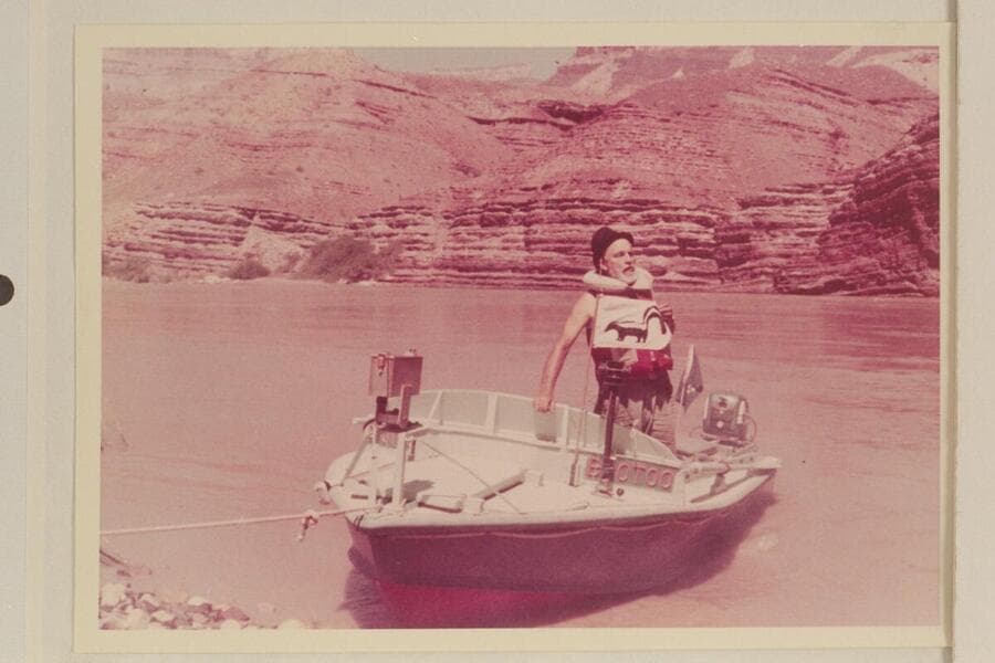 Ed l'Anson in the "Bootoo." Camp at Mile 70. Ed was the FIRST man to go through the Grand Canyon wearing a plug hat