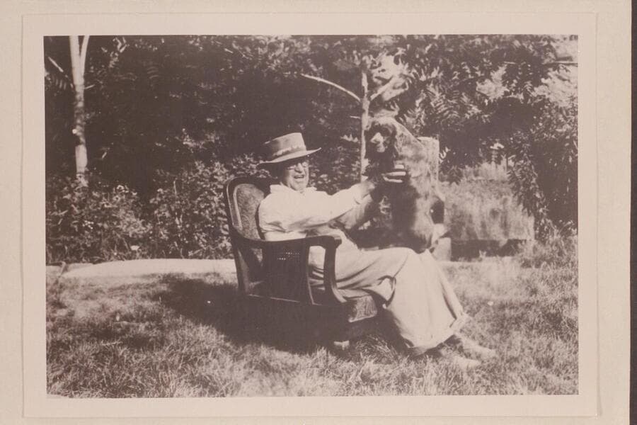Doc Inglesby in chair used by Julius Stone in Glen Canyon trip of 1938. The dog is "Judy."