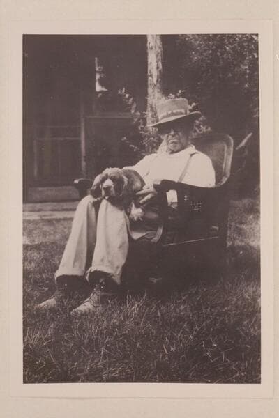 Doc Inglesby in chair used by Julius Stone in Glen Canyon trip of 1938. The dog is "Judy."