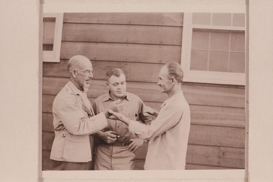 Meeting with Willis Johnson (center) and Harry Aleson (right) at Dragerton, Utah [Marston at left]