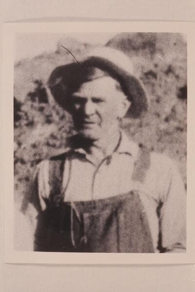 Bert Loper posed by his old cabin in Red Canyon. Photo by a member of the Scout Troop which Loper guided through Glen Canyon